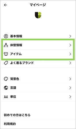 画面左上の『メニュー』から、お客様の体型情報の編集や、お持ちのアイテムの登録をすることができます。